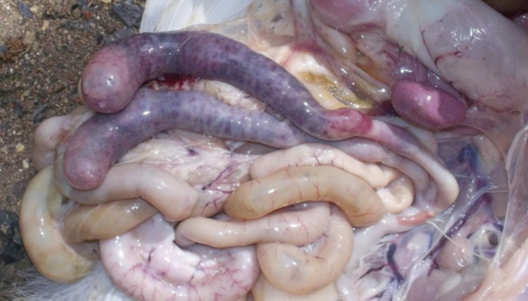 - During post-mortem, intestines are inflamed and filled with blood.