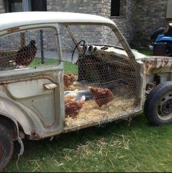 Look at the pictures above; you see vegetables planted in trousers, yam planted in sacks, chicken reared inside a used vehicle, laying birds kept in used kegs.
